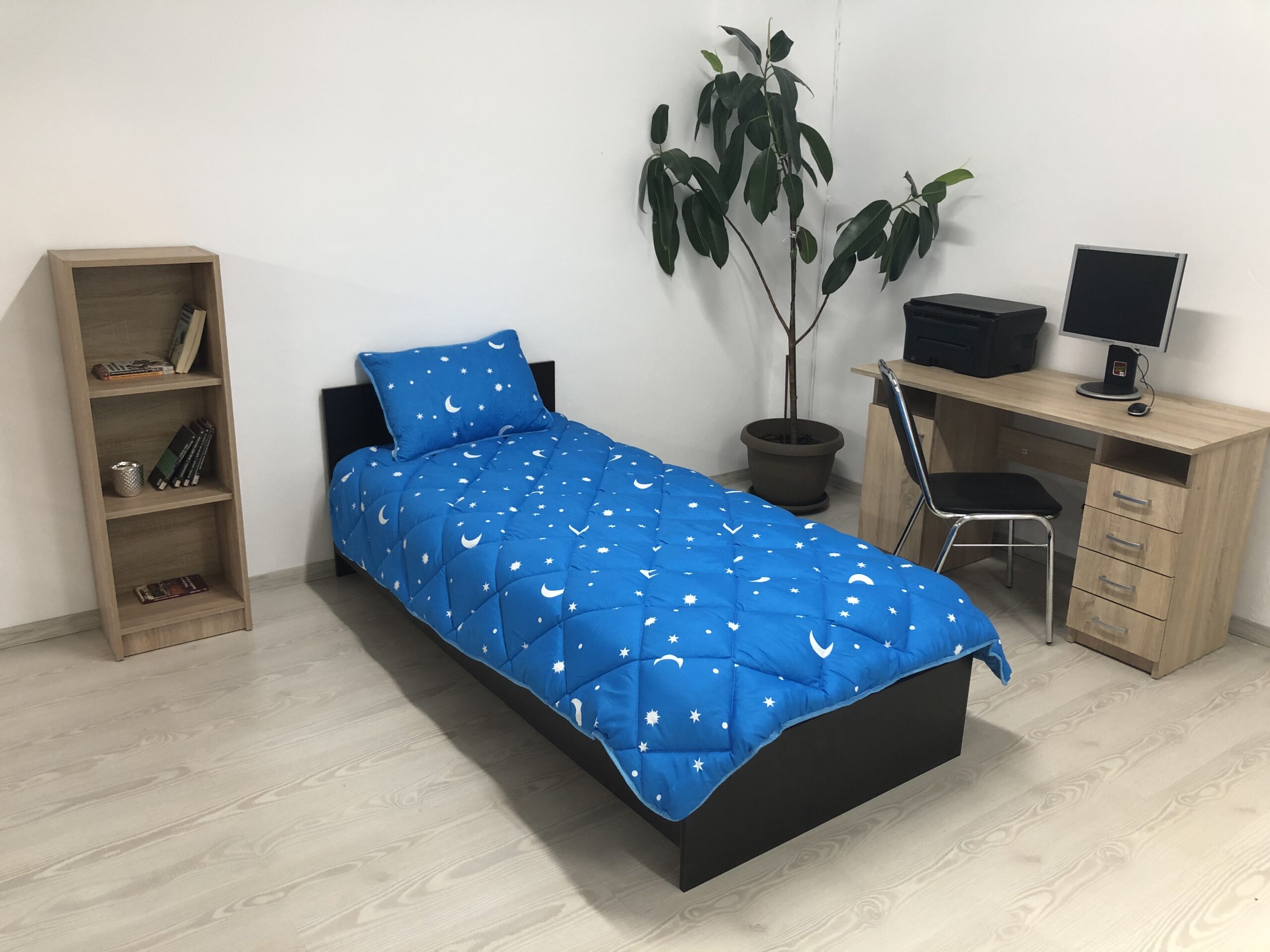 Set o perna 50×70 cm, o pilota 140×210 cm, culoare albastra, model “Luna si stele” (o persoana)